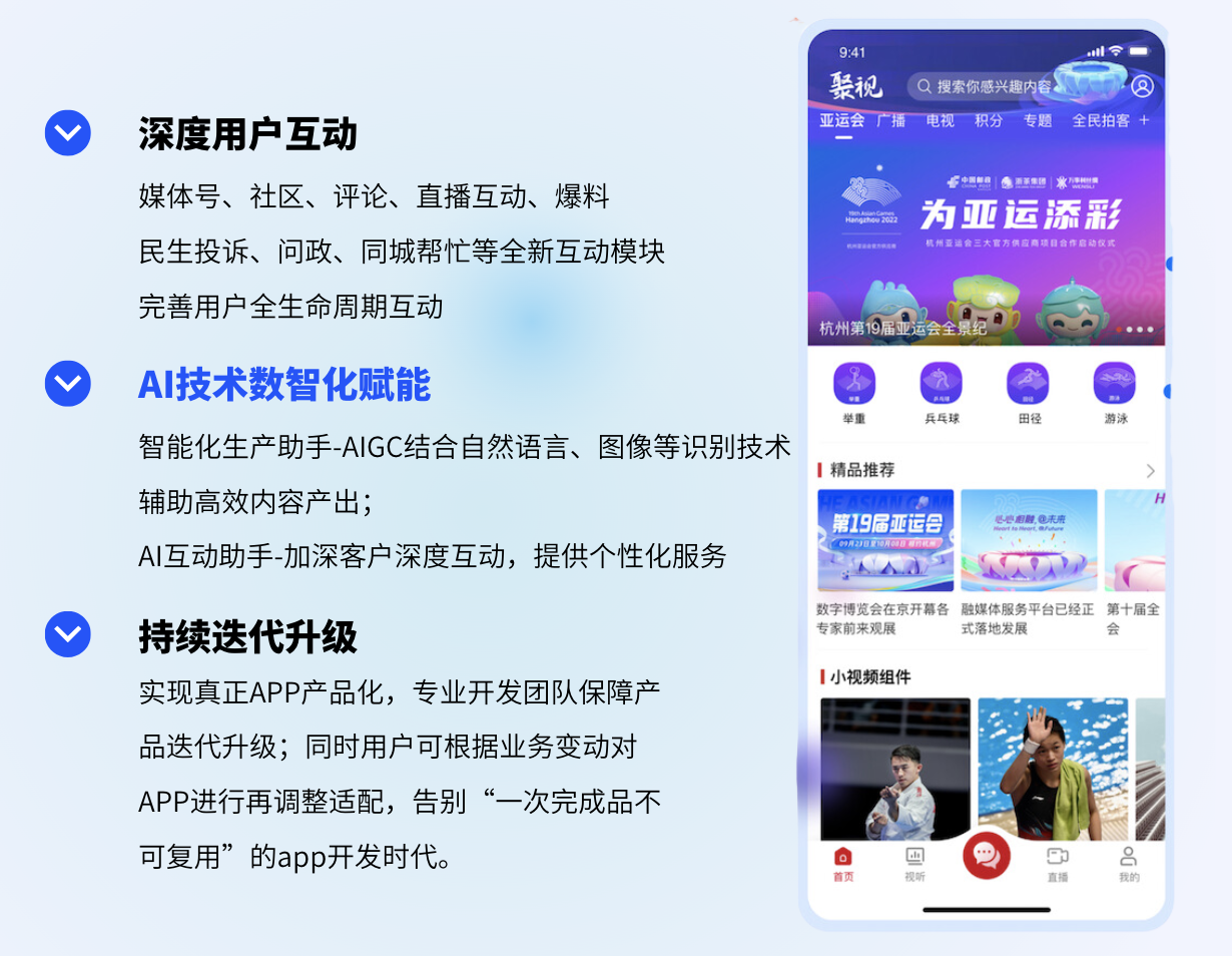 AI智能化赋能: 聚视融合AI技术,实现自然语言识别、音视频智能审核、内容产出等多项功能,包括AI 智能客服、AI审核员、AI产出助手等实用功能,可进一步提升运营管理效率,提升用户体验和满意度。