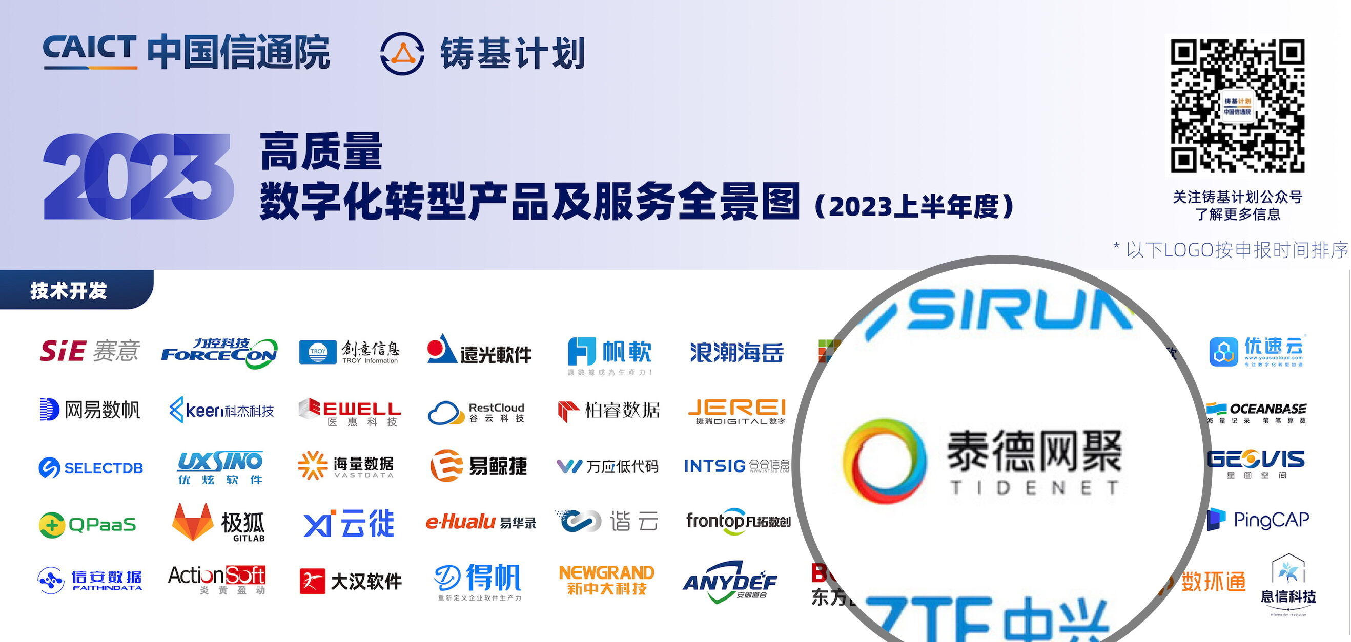 中国信通院的“铸基计划-高质量数字化转型行动”项目,旨在推动各行业企业数字化转型迈向更高质量的发展。在2023数字生态发展大会暨“铸基计划”年中总结规划会议上,各行业企业聚焦于数智产业升级等热门议题,通过探讨前沿技术的发展趋势,盘点数智化实践的成果和优秀案例,展示标杆性的数字化转型案例,为推动数字化转型实现高质量发展而努力。在大会现场,中国信通院发布了《高质量数字化转型产品及服务全景图(2023)》,泰德网聚凭借其卓越的低代码开发技术优势和突出的成果成绩,赫然跻身全景图“技术开发”细分领域之中,充分展示了市场和业界对泰德网聚技术开发能力以及在行业数字化转型实力所给予的高度认可。