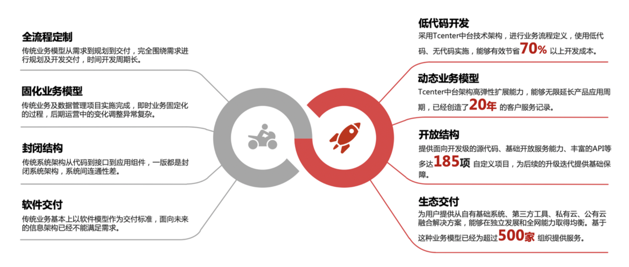 TCenter采用 ‘低代码+人工智能’双核心驱动模型,兼备集团级大型数字化应用业务能力、混合云中心和边缘计算整合能力、高效快速低成本的业务交付能力,可为用户提供完善流畅、优势显著的数字化转型升级服务。与传统开发模式相比,TCenter低代码开发可大幅度降低开发成本,提升开发效率,同时具备高灵活度扩展能力,实现产品的可持续更新使用。