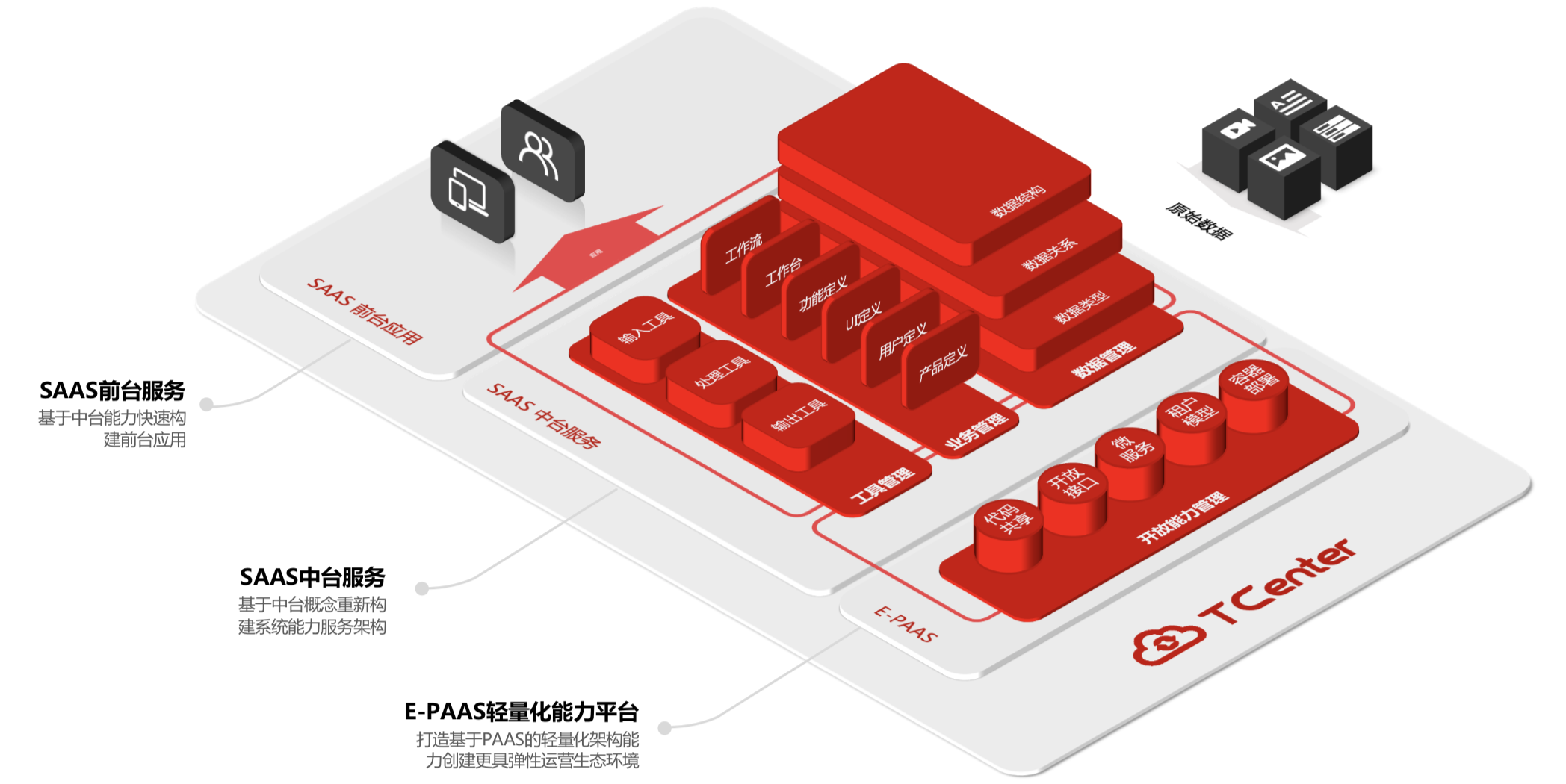 TCenter基于数据中台、业务中台、工具中台以及开放能力中台的“大中台”系统能力服务架构进行开发,致力于构建一个弹性运营生态环境,实现前台功能应用的快速构建。该卓越的技术架构保证了TCenter低码开发“化繁为简”的高效能开发优势。