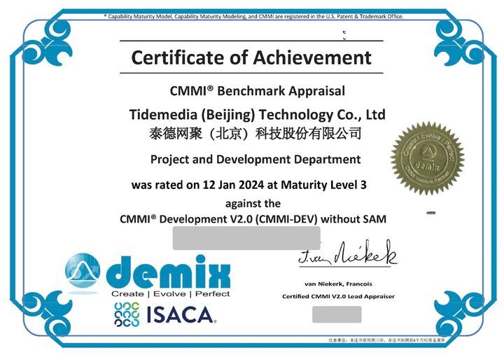 2024年1月,泰德网聚(北京)科技股份有限公司成功取得CMMI(Capability Maturity Model Integration)三级能力认证证书。此项认证彰显了泰德网聚在软件工程和项目管理领域国际化、标准化的卓越综合实力,为泰德网聚业务的可持续开展提供了更加坚实的技术保证及全新动能,同时为泰德网聚未来的软件及项目管理体系建设规划提供了明确的指引。
