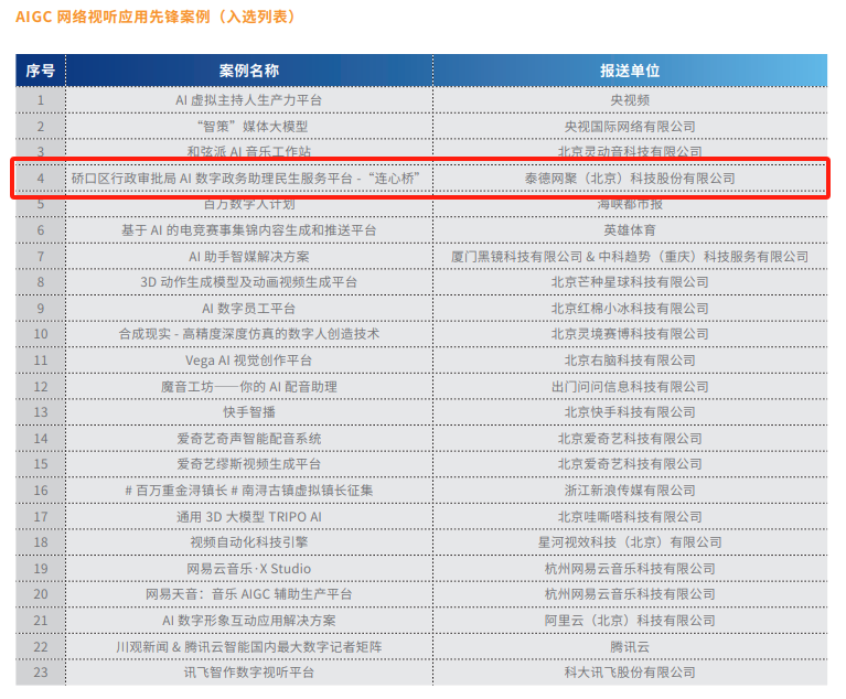 《案例》同步收录了23个来自国内头部科技公司关于视听领域的底层模型、解决方案及应用案例,其中泰德网聚在武汉市硚口区搭建的《硚口区行政审批局AI数字政务助理民生服务平台-“连心桥”》也入选其中。