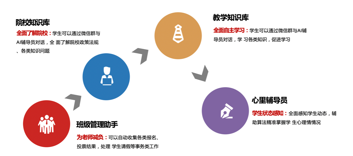 泰德网聚教育“AI辅导员+AI舆情专员”应用解决方案,通过加入AI智能助手角色,帮助校方实现对学生“生活+学习”多方位关注,及时提供支持与帮助。AI舆情专员可帮助校方管理人员实现实时收集社群信息,进行社群数据分析,帮助学校和教育机构更好地了解和应对学生和社会的需求,及时发现校内舆情并迅速反应进行处理;AI辅导员角色可帮助辅导员处理繁多的班级及学生管理事务,为学生提供智能自动咨询与反馈渠道,弥补了辅导员在时间精力上的局限性,使得学生可以获得更加流畅、细致及个性化的教育体验。